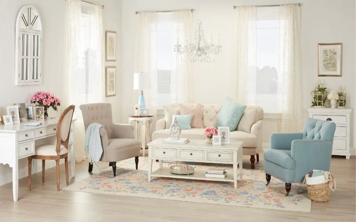 dekorasi dan temanya serta karakternya dibentuk dari penggunaan warna-warna lembut (soft), tekstur yang lembut, material natural dan menyajikan daya tarik romantis dengan gaya dan citarasa country.