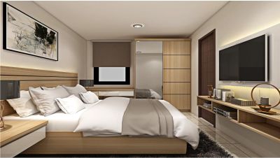 Kamar tidur (bedroom) dengan berbagai jenis bantal dilengkapi dengan TV sebagai media entertainment, cabinet yang juga berfungsi sebagai ambalan meja. dilengkapi dengan nakas yang berfungsi dengan baik, warna netral (neutral color) dengan undertone warna earthy memberikan efek nyaman dan homy tetapi tetap warm.