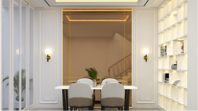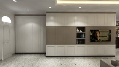 Anda bisa melihat wall panel diruangan ini yang menyatu dengan cabinet yang berbentuk simpel, yang demikian itu merupakan ciri dari interior design minimalis.