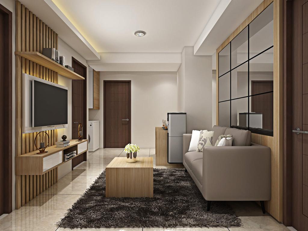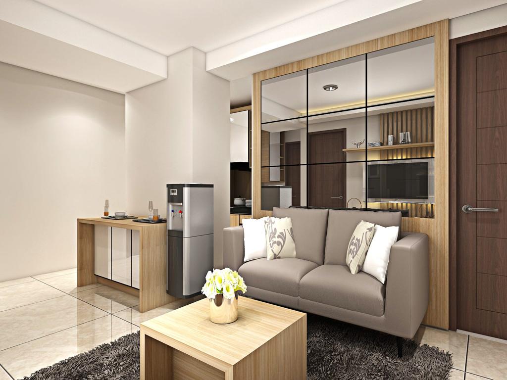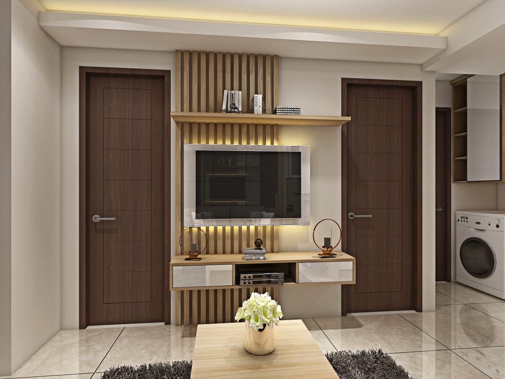 Wallpanel yang dihiasi dengan TV untuk media entertainment, dibumbuhi dengan warm lighting membuat suasana warm Design Interior Livingroom (Ruang tamu) ini menjadi semakin kental, Mirror dibagian dinding yang lain membuat ilusi ruangan menjadi lebih luas dari yang sebenarnya.