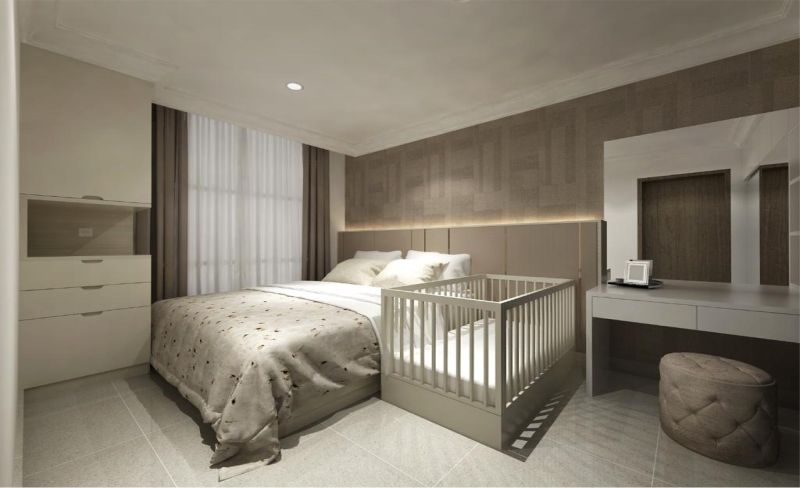 Meskipun menggunakan warna netral tetapi menggunakan undertone warm untuk menghasilkan suasana hangat dan homy bagi penghuni kamar ini, kamar seperti ini cocok untuk anda yang memiliki luas kamar terbatas tetapi ingin mendapatkan fungsi yang lebih, di kamar ini anda mendapatkan kabinet yang banyak, meja dengan cermin melengkapinya dan tempat tidur bayi, ruangan ini didesign dengan pemikiran utama untuk keluarga yang mempunyai bayi.