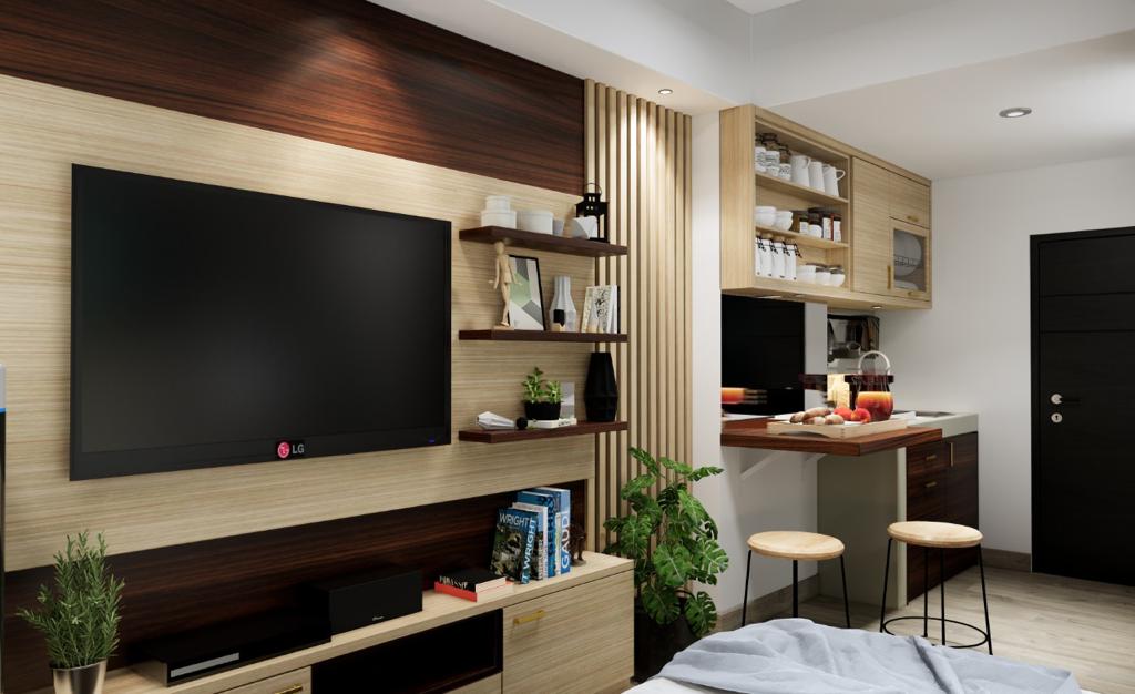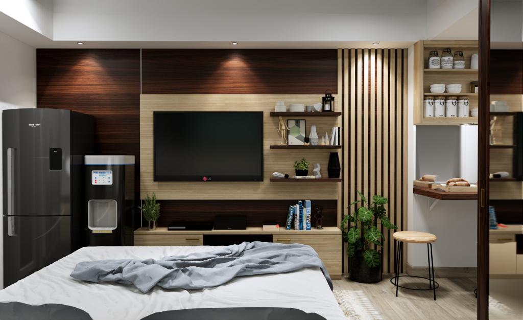 TV dalam ruangan ini menunjukkan bahwa penghuni ruangan ini menghendaki adanya media entertainment, dipadukan dengan wallpanel dan ambalan-ambalan dan laci melengkapi fungsi dari wallpanel itu sendiri. Foliage yang bisa anda temukan diantara panel-panel ini semakin menambah ruangan menjadi teduh dan hidup, seolah menunjukkan bahwa ada kehidupan dalam ruangan ini. design ruangan ini telah melebihi fungsi dari sebuah kamar, disini anda bisa melakukan banyak hal dalam kehidupan anda.