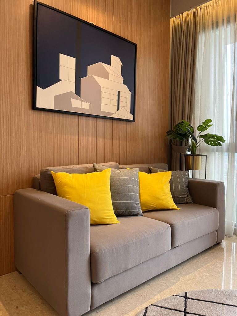 ruang keluarga tidak mesti harus memakai bangku saja , sofa dengan warna netral seperti abu abu pun bisa memberikan kesan modern dan berkelas. Ornamen sederhana yang menempel di dinding semakin memperkental gaya design minimalis di ruangan ini, penempatan foliage dalam vase di pojok ruangan merupakan tren yang sedang terjadi saat design ini dibuat yang merupakan bentuk realisasi dari gaya design modern dimana design modern harus mengikuti tren yang ada saat itu, adanya foliage (tumbuhan) di dalam ruangan ini juga mengarah pada gaya design interior farm house.