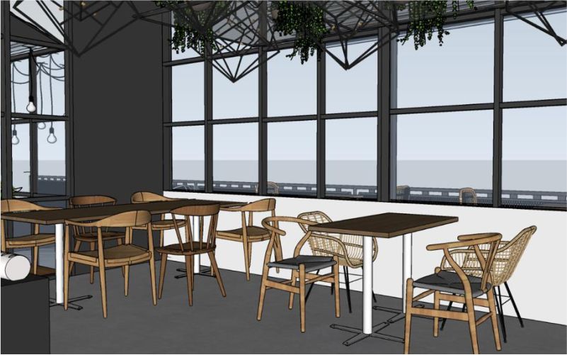 Sekilas anda akan melihat ruangan ini tampak tanpa dinding yang hanya merupakan rangka-rangka dari bahan logam, atap tanpa ceiling, lampu yang digantung begitu saja yang dihiasi dengan ornament yang juga terbuat dari besi.