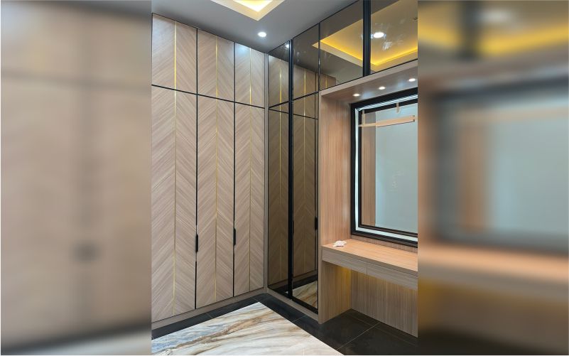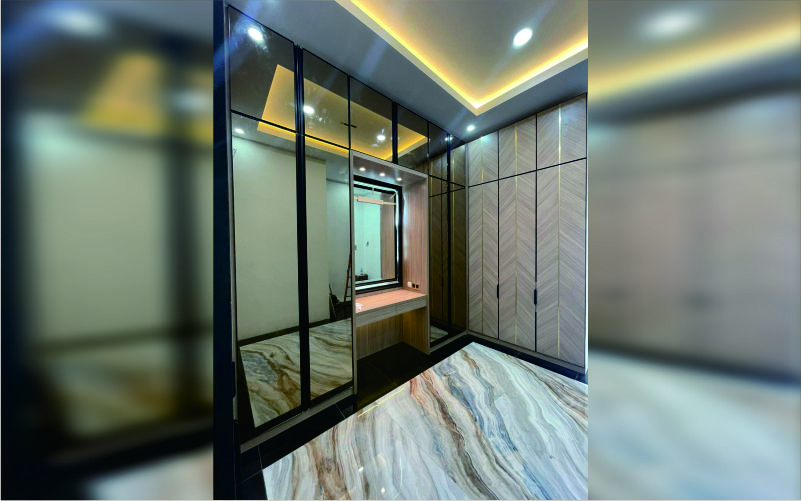 Meja rias salah satu furnitur yang perlu ada di dalam kamar untuk memudahkan wanita merias wajah. Termasuk lemari pakaian di design bagian atas untuk memudahkan si pemilik bisa meletakkan barang barang yang dimilikinya. sehingga kamar terlihat sangat mewah.