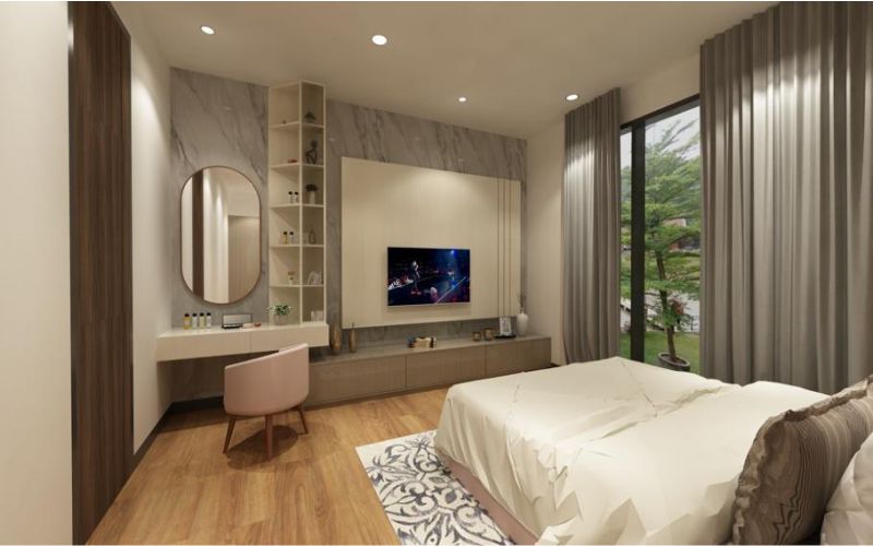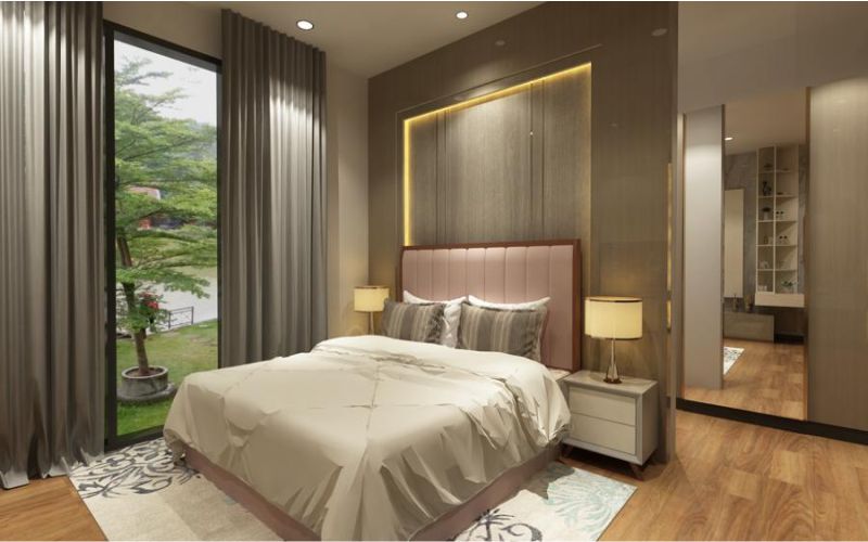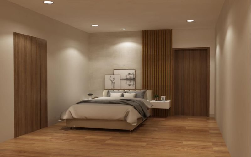 Penggunaan Earthy tone memberikan efek homie pada setiap ruangan yang ada di photo berikut, dipadukan dengan warm lighting menambah suasana hangat bagi penghuni ruangan ini, nakas - kanibet - meja rias - cermin semua tertata dengan serasi dan rapi, anda tidak akan mendapatkan ruangan seperti ini tanpa perencanaan yang matang.