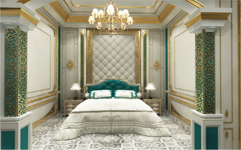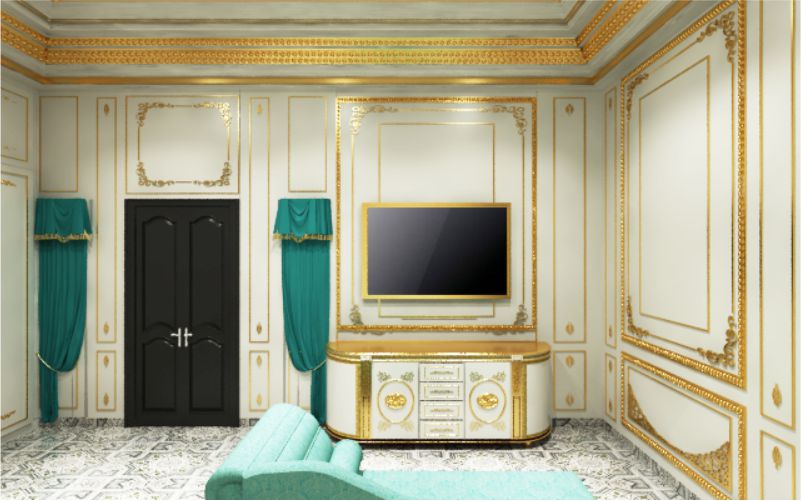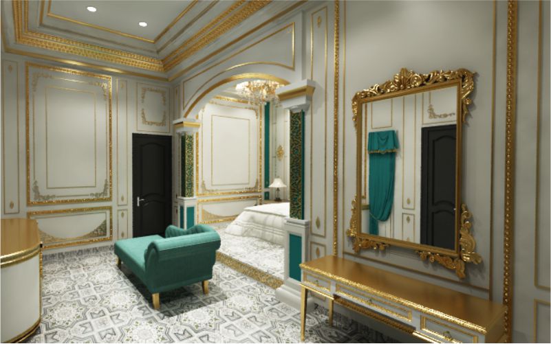 Dalam ruangan ini anda bisa melihat ornamen dalam setiap lekukan dan pojokan, baik pojokan dan lekukan interior ataupun pojokan dan lekukan ruangan sehingga ornamennya menjadi sangat banyak, ruangan ini hanya menggunakan warna putih dan gold, walaupun begitu ornament yang menghiasi ruangan ini melahirkan efek mewah dan classy.