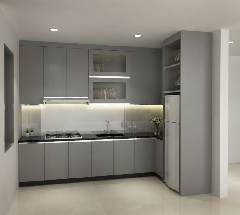 Jika anda perhatikan Kitchen set ini menggunakan bentuk yang sangat minimalis dengan Warna Monochromatic, Warna-warna Netral (Neutral colors) dengan warna abu-abu membuat kitchen set ini menjadi bernuansa soft. Design Interior Minimalis mengutamakan space availability (ketersediaan ruang) yang diterapkan dalam kitchen set ini memberikan keleluasaan dan kelegaan dalam ruangan ini.